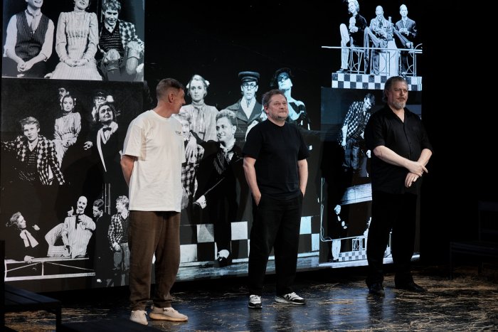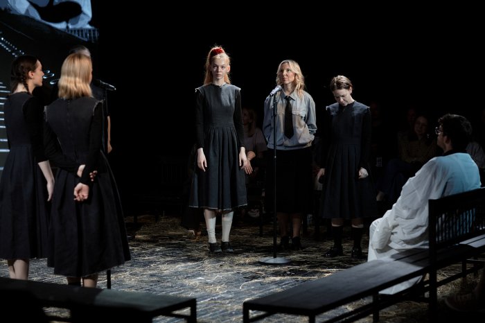 В финале на камерной сцене становится многолюдно. Лайв-съемка проецирует череду артистов на огромный экран позади — создается иллюзия бесконечной цепочки людей, которые соединяют прошлое Театра Пушкина с его настоящим.