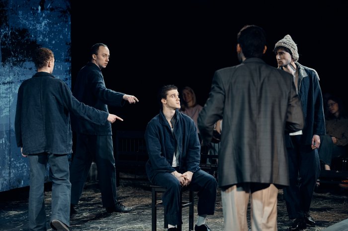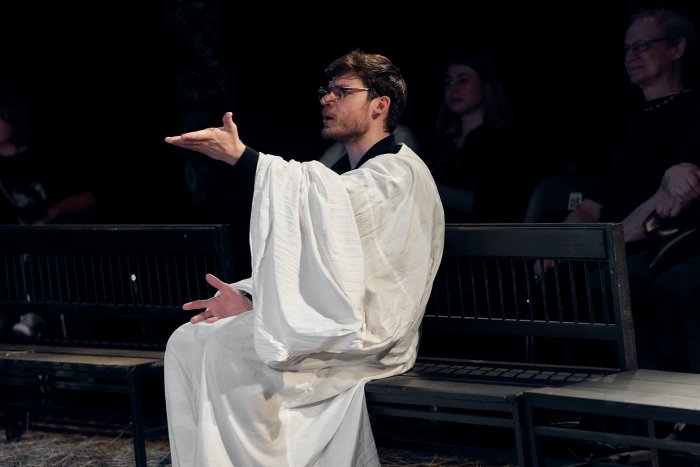 Действие начинается еще до того, как зрители занимают места. Ступая на разбросанное по залу сено, они слышат «Прикурить не найдется?» и «Подайте копеечку». Это артисты, одетые в темно-синие робы, уже начали погружать нас в историю. Сцену с трех сторон окружили зрительские стулья, а задником стал огромный видеоэкран, который притворился бетонной стеной с облупленной краской.